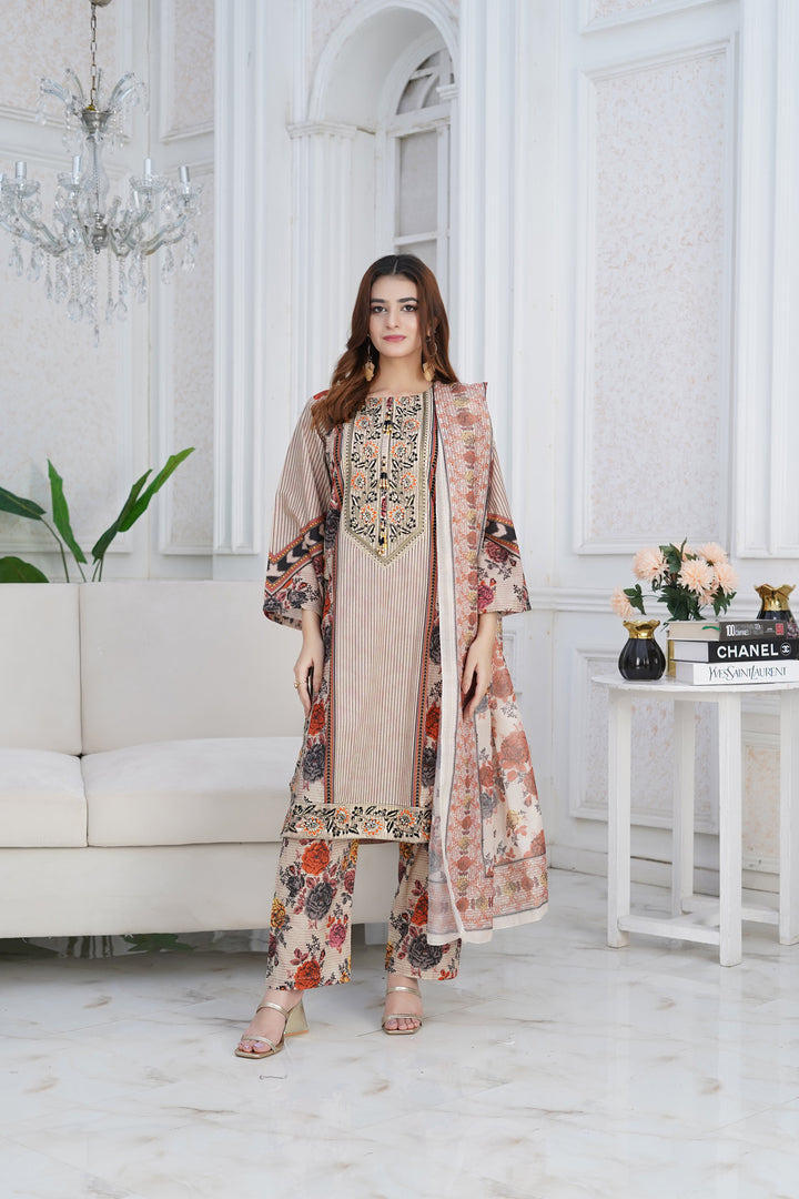 Refresh your summer wardrobe with our Serenity 3-Piece Suit, a beautifully designed ensemble crafted from premium cotton lawn. Rooted in traditional Pakistani elegance, this occasion-ready outfit blends timeless charm with modern sophistication. The soft pastel peach hue brings a breezy vibrance, while the lightweight, breathable fabric ensures all-day comfort.
